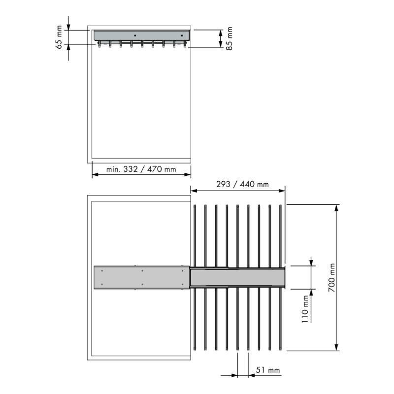 Le porte-pantalons extractible est un système coulissant intégré qui permet de ranger jusqu’à 18 pantalons. Il se monte dans un volume meuble prévu à cet usage, pour un accès facilité et un rendu esthétique sobre et raffiné. Le mécanisme inclut des supports antidérapants et un amortisseur pour un mouvement fluide. Il comporte aussi un espace rangement “porte-objets” muni d’un tapis antiglisse.