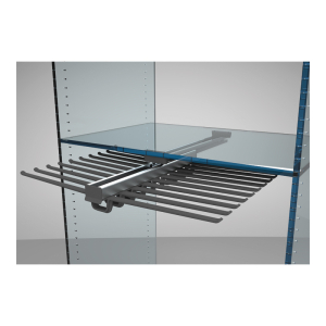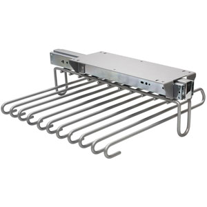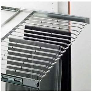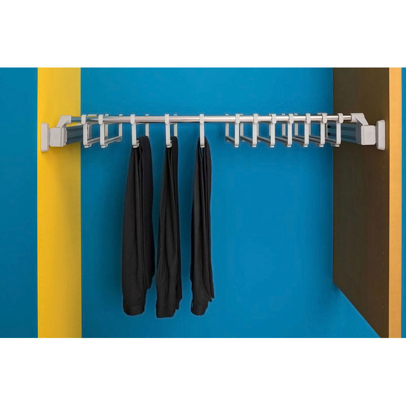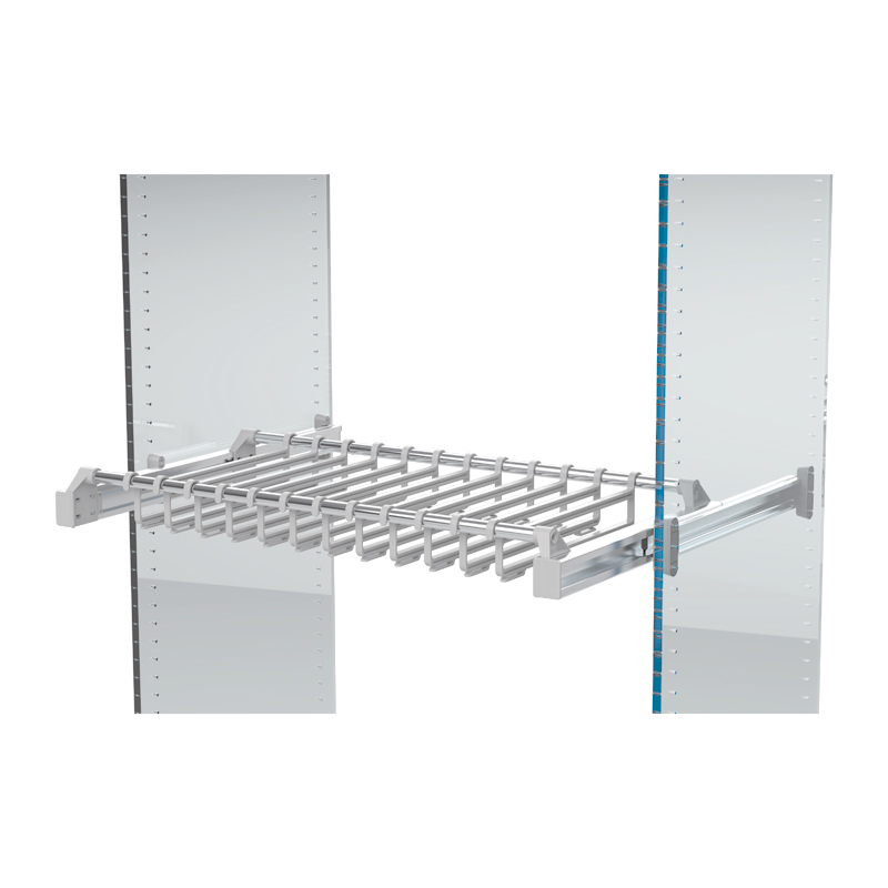 Porte pantalons coulissant extensible.Équipé de 12 bras amovibles à 2 niveaux.Peut recevoir jusqu'à 24 pantalons et sur les crochets inférieurs 12 jupes ou cravates/ceintures.Possibilité d’ajouter des bras porte pantalons et autres accessoires compatibles (cintres porte chemise, corbeilles).Les bras porte pantalons et supports sont en nylon renforcé de fibres de verre, décor gris alu.Fixations latérales sur coulisses aluminium à sortie partielle : sortie 310 mm.Tubes transversaux extensibles en acier chromé. Livré avec fixations.
