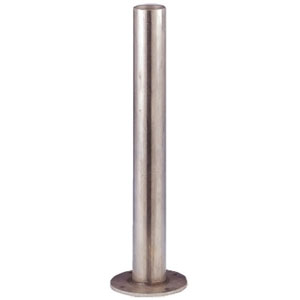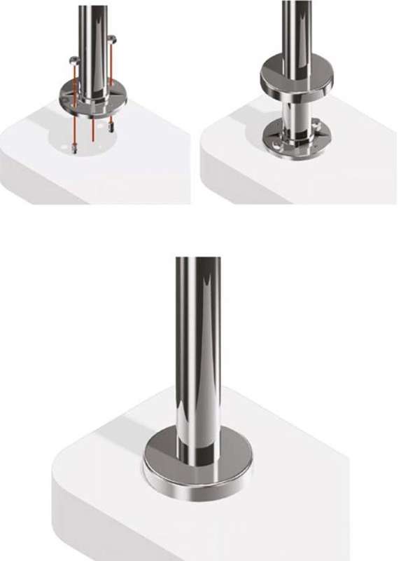 Poteau de garde corps avec embase soudée et cache embase.Embase à visser (4 trous Ø 11mm) : diamètre 100mm et épaisseur 8mm.Rosace cache embase : diamètre 105mm et épaisseur 18mm.
