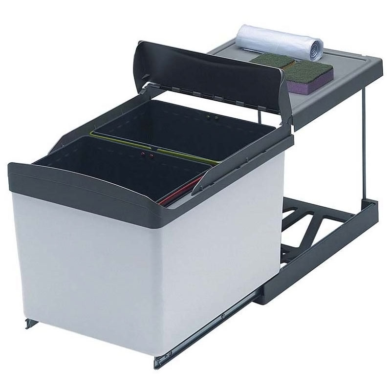 2 seaux de 16 L.Sur coulisses à billes sortie ¾. Poubelle à sortie manuelle ou automatique avec relevage du couvercle.Pour caisson largeur 400 mm si ouverture manuelle. Pour caisson de 450 mm si ouverture automatique.Sortie automatique lors de l'ouverture de la porte latérale droite ou gauche grâce à son mécanisme d'entrainement breveté.