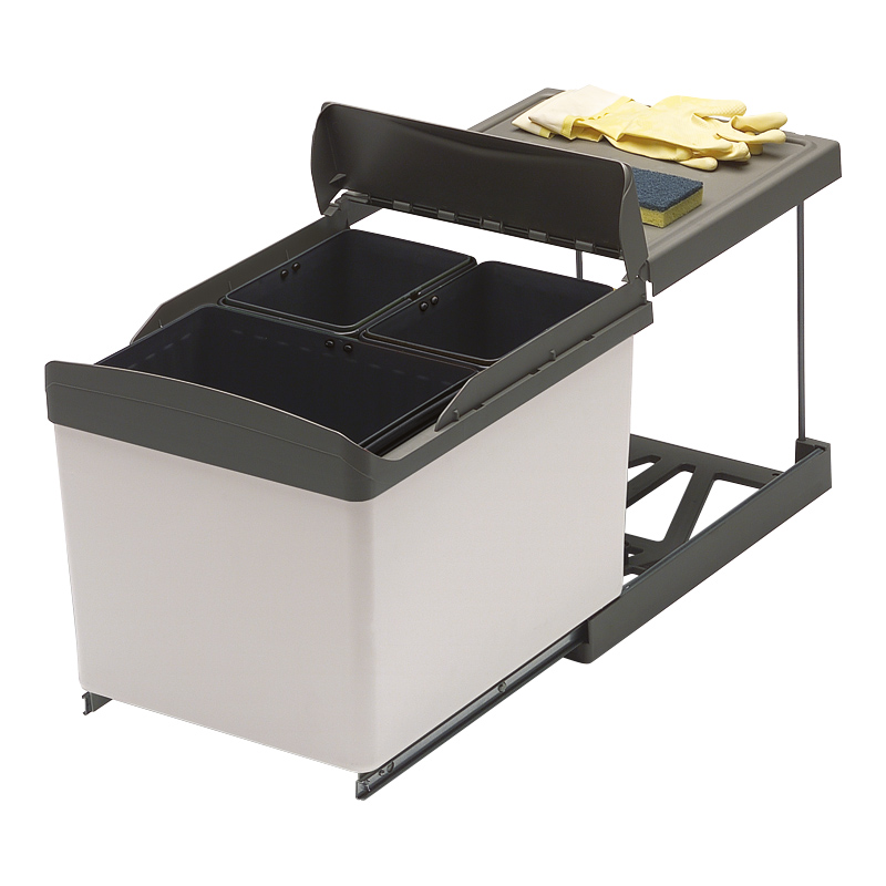 Poubelles sélectives 1 x 16L et 2 x 7,5L.Sur coulisses à billes sortie ¾. Poubelle à sortie manuelle ou automatique avec relevage du couvercle.Pour caisson largeur 400 mm si ouverture manuelle. Pour caisson de 450 mm si ouverture automatique. Sortie automatique lors de l'ouverture de la porte latérale droite ou gauche grâce à son mécanisme d'entrainement breveté.
