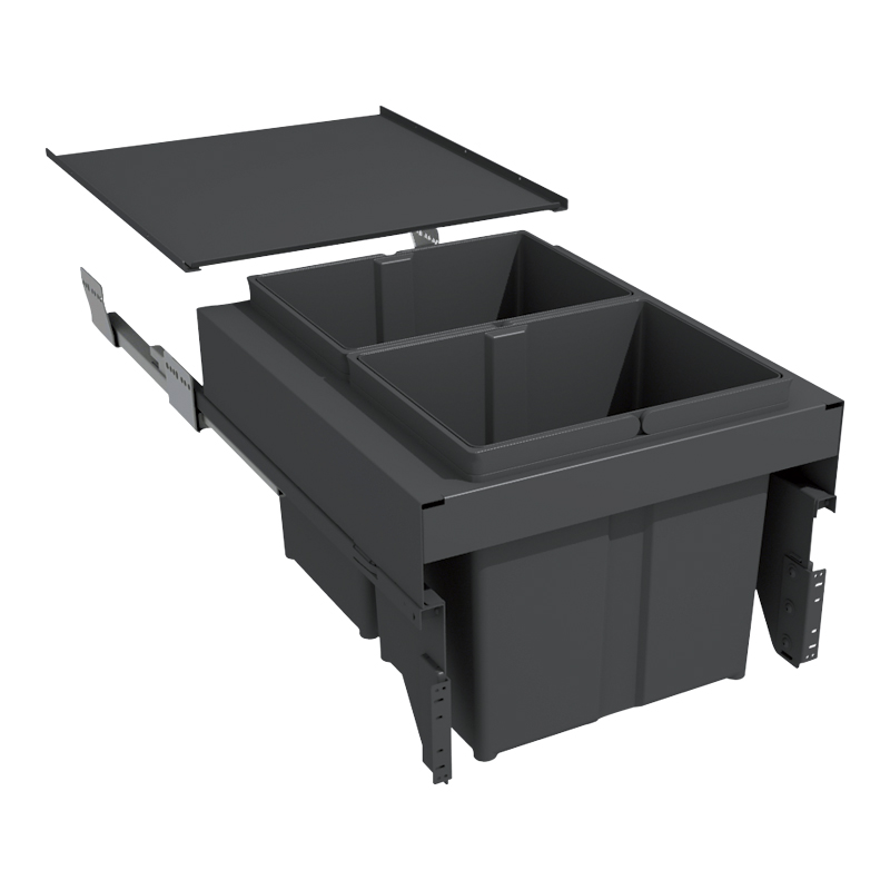 Collecteur grande capacité avec seaux suspendus, côtés en métal et coulisses incluses.Adaptable sur caisson épaisseur 16 mm ou 19 mm. 2 seaux de 17L