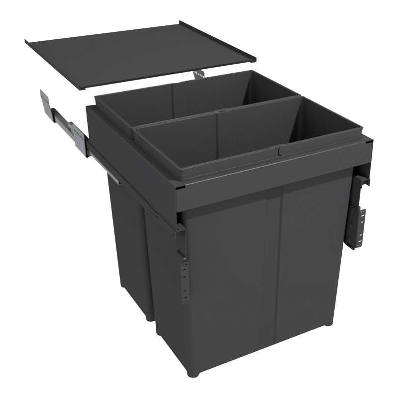 Collecteur grande capacité avec seaux suspendus, côtés en métal et coulisses incluses.