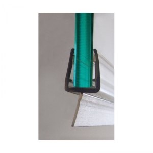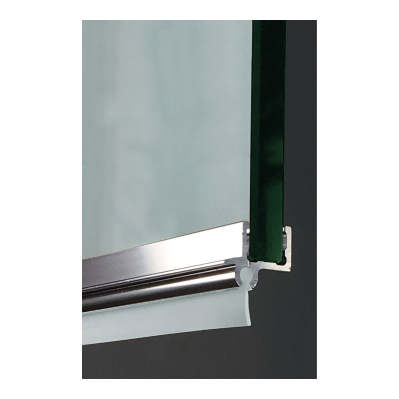 Profil déflecteur horizontal en aluminium avec joint lèvre caoutchouc, pour bas de porte battante.Facile à poser par clipsage et recoupable.Collage silicone pour verre de 8mm.Joint de réduction fourni pour verre de 6mm.