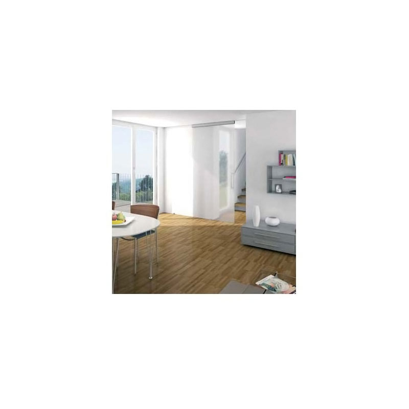 Le verre est simplement glissé dans le logement pour vitrage fixe du rail. Un profil pour le montage sol/mur, à fleur ou encastré, assure la stabilité de l'ensemble.