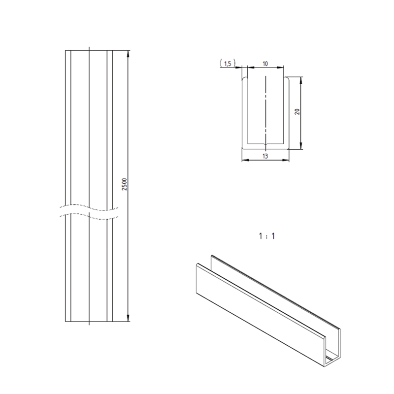 Pour la conception de cloison fixe en verre.Angles arrondis.Guide de perçage au fond du profilé.Résistance à la corrosion, utilisation possible dans la salle de bain.