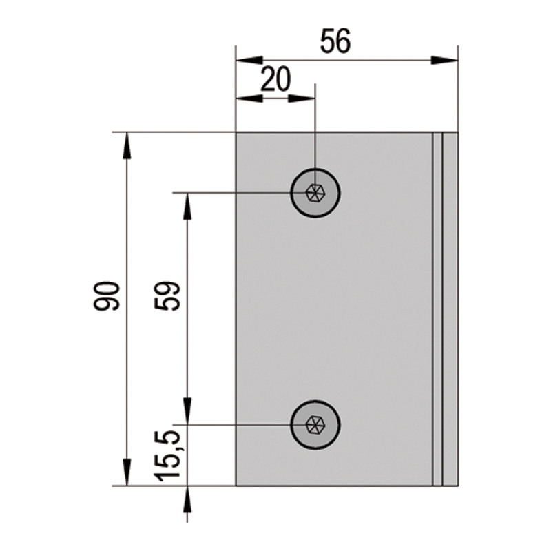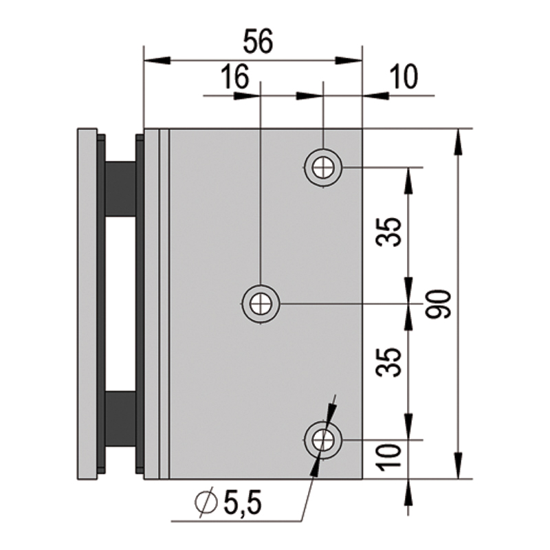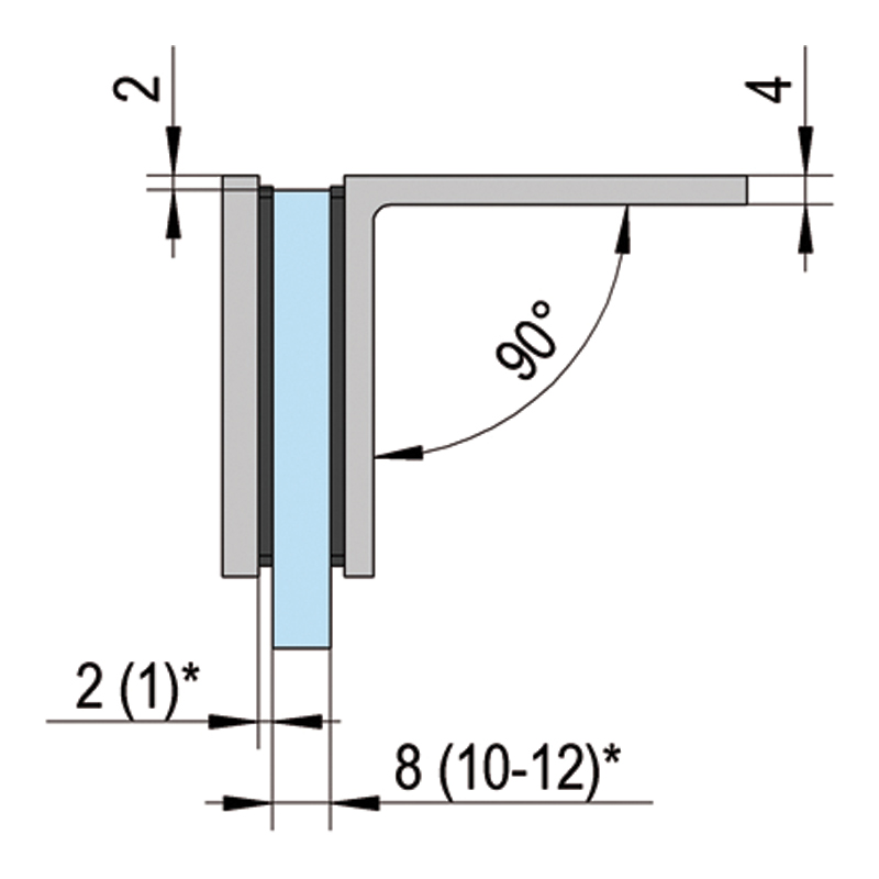 Pince raccord d'angle 90° verre/mur, pour cloison fixe.Livré avec cales, sans matériel de fixation.Hauteur 90mm x largeur 56mm.
