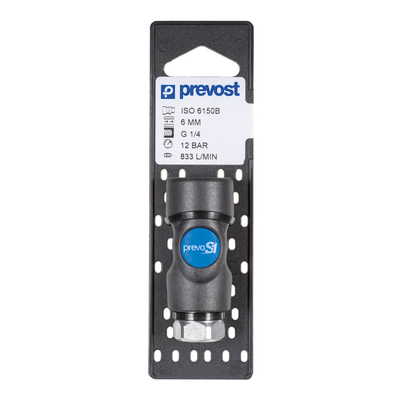 Profil : ISO 6150B sécurité one push (anti-coup de fouet) pression d'utilisation : 2 à 12 bar débit sous 6 bar :833 l/min Ø de passage : 6 mm température :-15°C à +70°C matière : corps composite point fort : anti-rayures antistatique.