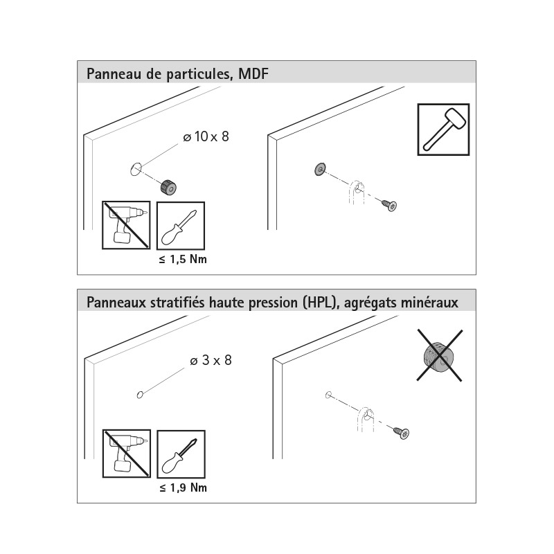 Pour les panneaux de particule, MDF, percer à D.10x8mm, enfoncer l'insert puis fixer l'attache façade à l'aide des vis autotaraudeuses.