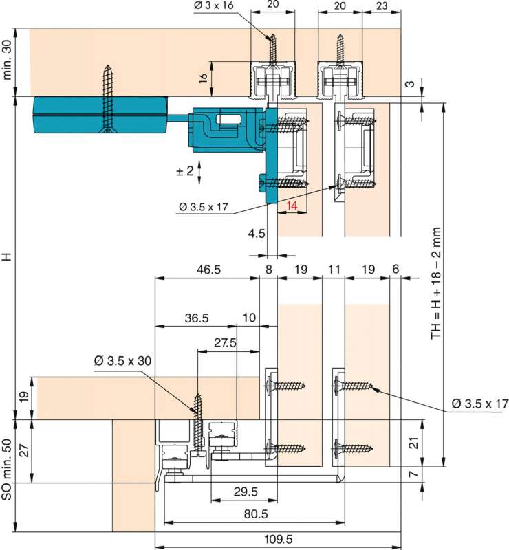 Rail de guidage bas double perforé.Pour les ferrures d'armoire Clipo 26 / 36 H MS.