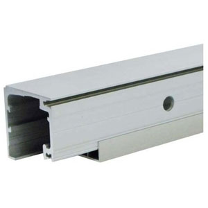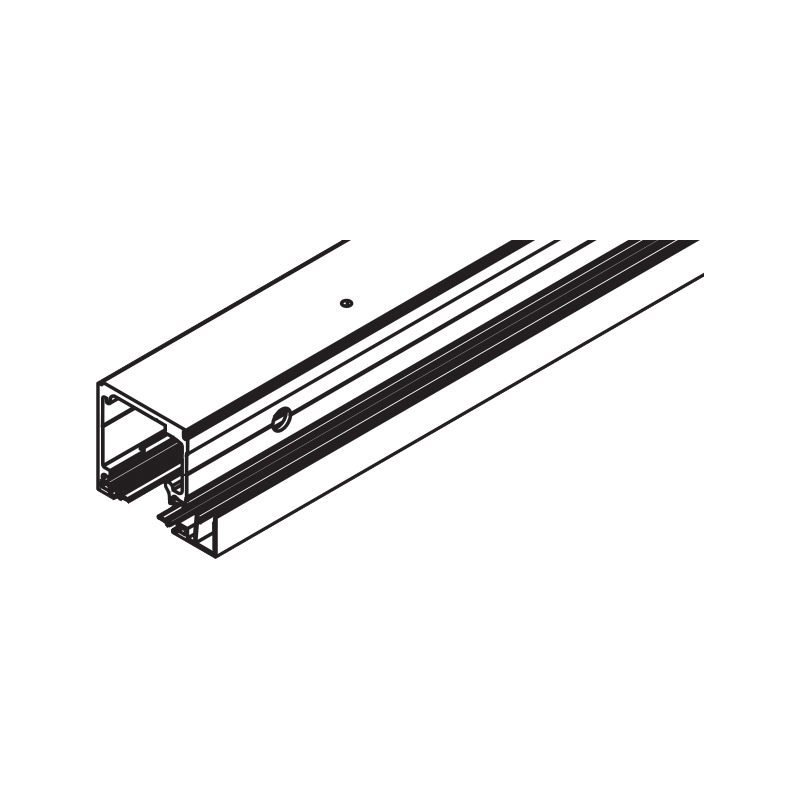 Rail de roulement percé pour montage intégré au plafond avec ou sans glace fixe, et profil de recouvrement inférieur inclus.Le profil pour glace fixe n'est pas inclus, à commander séparément.