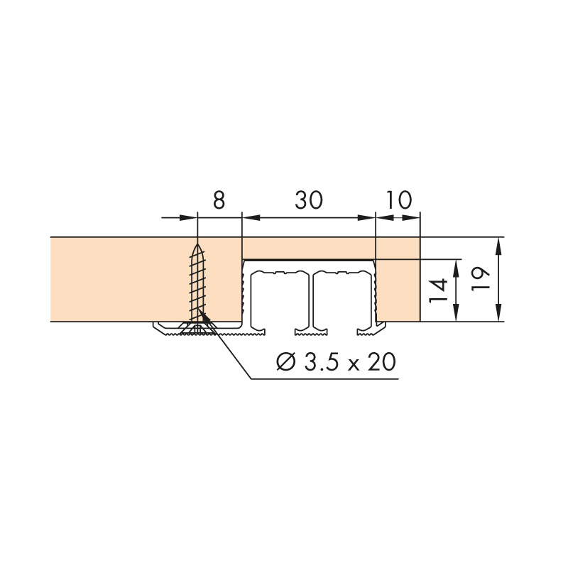 Fixation latérale à visser.Rail percé. Pour panneau de 19 mm.Encastrement 14 x 30 mm.