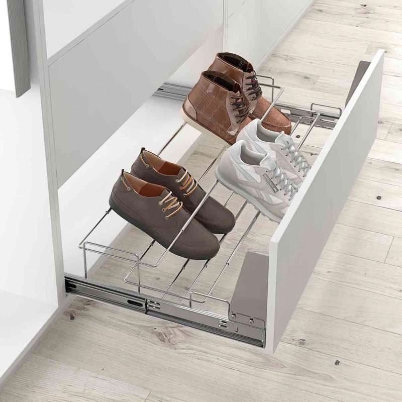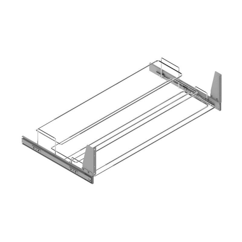 En fil d'acier.Largeur réglable.Sur coulisses à billes en acier zingué, sortie totale.Rappel en fin de course.Fixation latérale.Fixé avec équerres frontales pour fixation d'une façade.