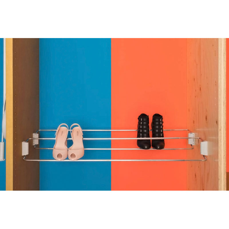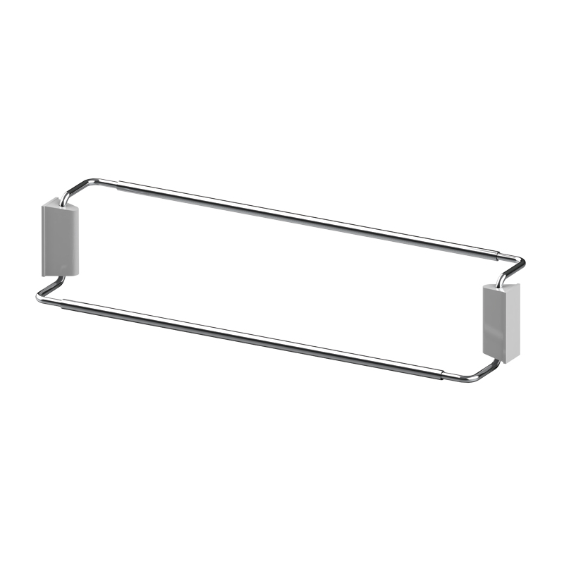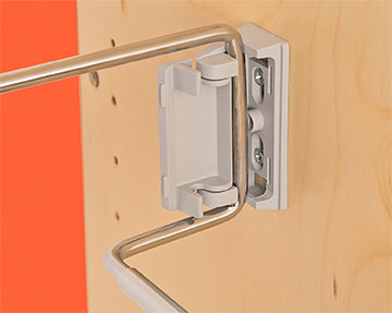 Fixations latérales sur mur ou intérieur de placard.Platine de fixation en nylon renforcé par fibre de verre, décor gris alu.Support extensible en fil d'acier chromé.