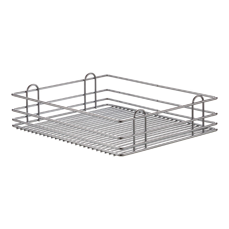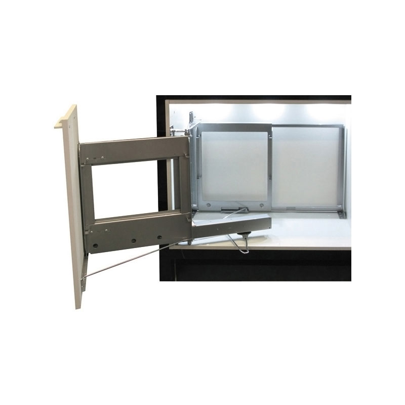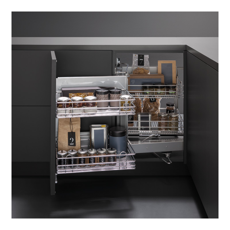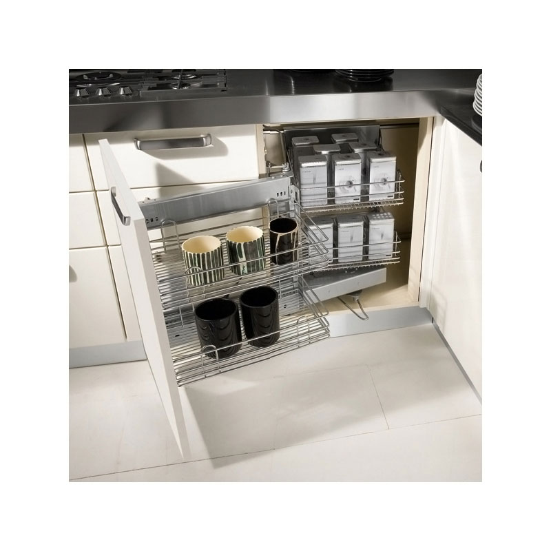 L’ouverture de la porte entraîne l’extraction du cadre pivotant, faisant ainsi coulisser face à l’ouverture, la partie de la ferrure située dans l’angle mort du meuble.Amortisseur de fin de course intégré.Retour automatique en fin de course.Fermeture silencieuse.Ferrure complète décor argent avec 4 corbeilles.