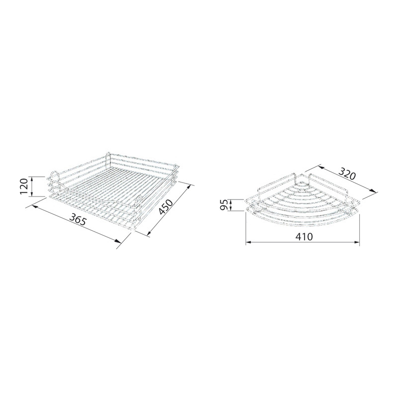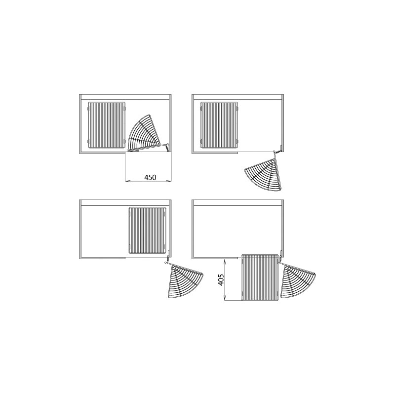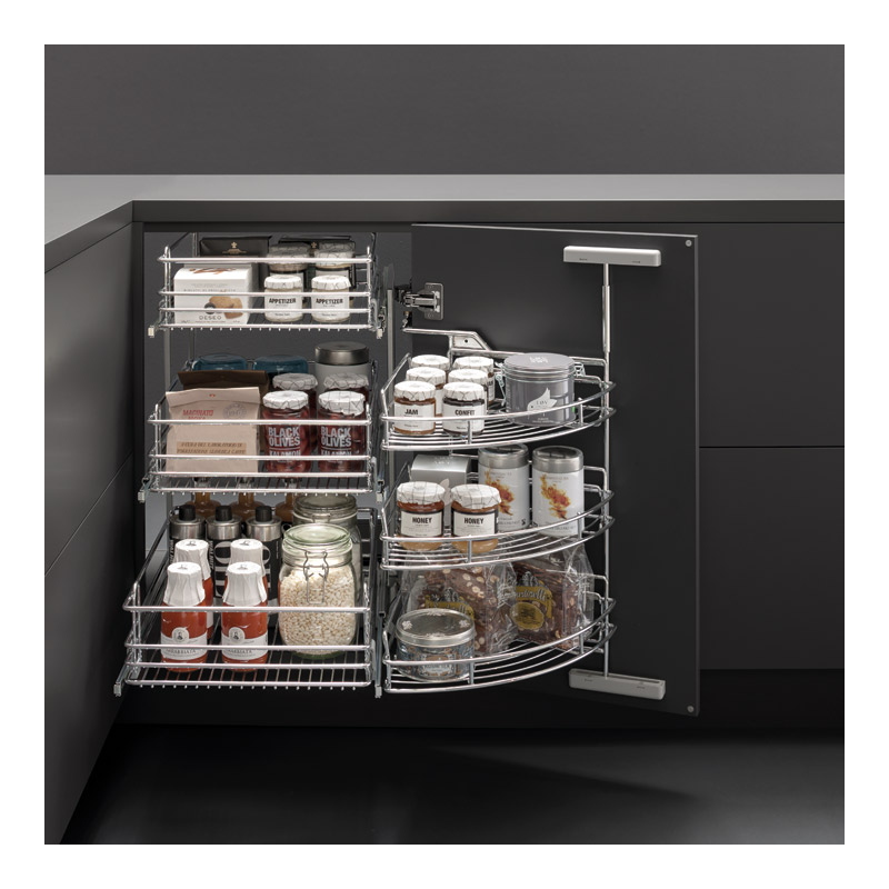 Cette ferrure permet un accès total au contenu des paniers.L'ouverture de la porte entraîne les paniers rectangulaires face à l'ouverture.Ces paniers sur coulisses à sortie totale sont ensuite extractibles individuellement.La fermeture de la porte les entraîne dans l'angle mort du caisson.Mécanisme d'angle pour meuble de 900 mm avec porte de 450 mm.Les coulisses sortie totale sont équipées d’un rappel en fin de course.Nécessite des charnières 165° sur la porte.Livrée complète avec 6 corbeilles.Kit comprenant :