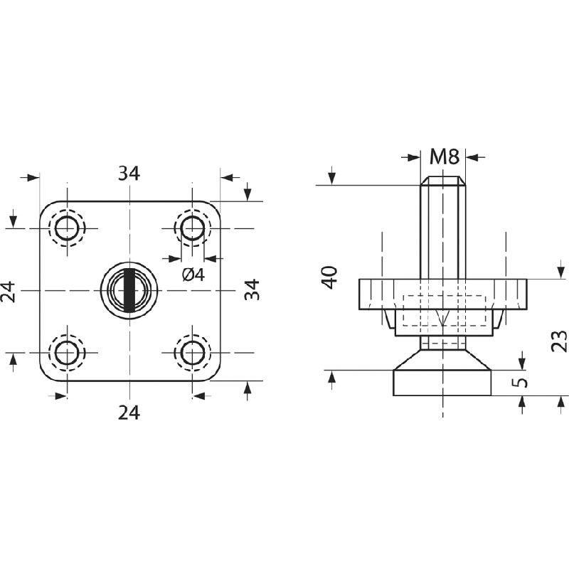 Régulateur acier et pvc.Platine PVC noire 34 x 34 mm.Réglage vertical de 10mm clé 6 pans de 4mm.Perçage traversant Ø 10mm.Hauteur sous plancher mini 23mm.Fixation sous le plancher du meuble épaisseur 19mm.