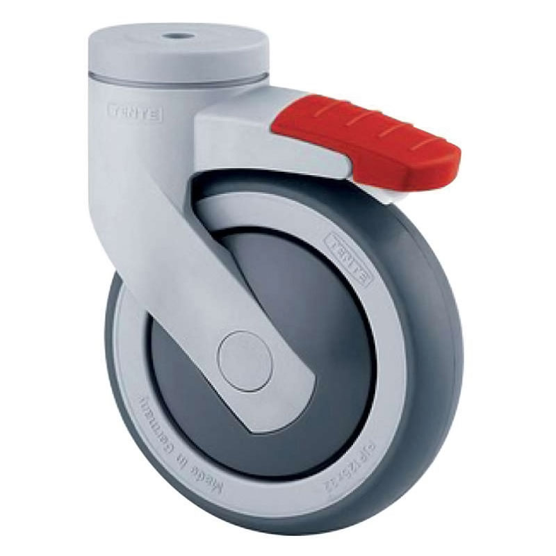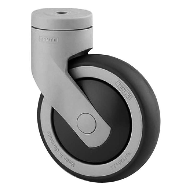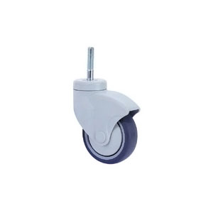 Roulette nylon et polypropylène avec trou de fixation Ø 13mm.Pivot sur double roulement à billes.Roues sur roulement à billes de précision.Bandage caoutchouc semi élastique gris non tachant.Dureté A 92 Shore.Pare fil intégré.