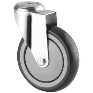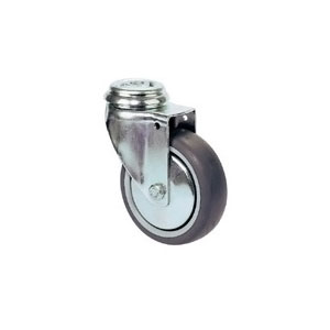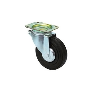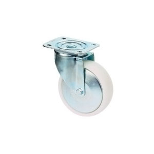 Roulette Ø 125mm polypropylène bandage caoutchouc synthétique gris.Roulette Ø 160 et 200 mm polypropylène noir bandage plein.Roulette pivotante à blocage double effet sur 2 couronnes de billes. Moyeu à rouleaux. Pare-fils.