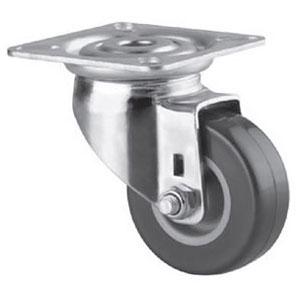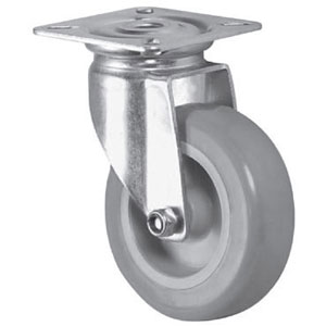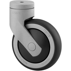 Roulette avec bandage en polyuréthane à moyeu lisse.Axe boulonné.Pivot sur double roulement à billes.Trou de fixation Ø 11mm.