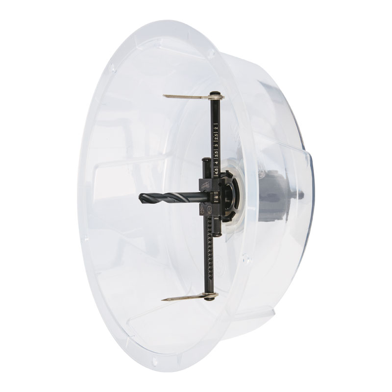 Idéale pour les tuyaux de climatisation, ventilateurs, plafonniers lumineux, haut-parleurs encastrés dans le plafond 100 % d'extraction de poussières lors d'un forage. Diamètre ajustable de 51 mm à 178 mm. Marquage au laser de Ø 51 à 178 mm. A utiliser sur du placoplâtre (25 mm max) et les dalles de plafond. Non conçu pour les supports en bois.