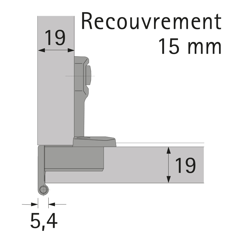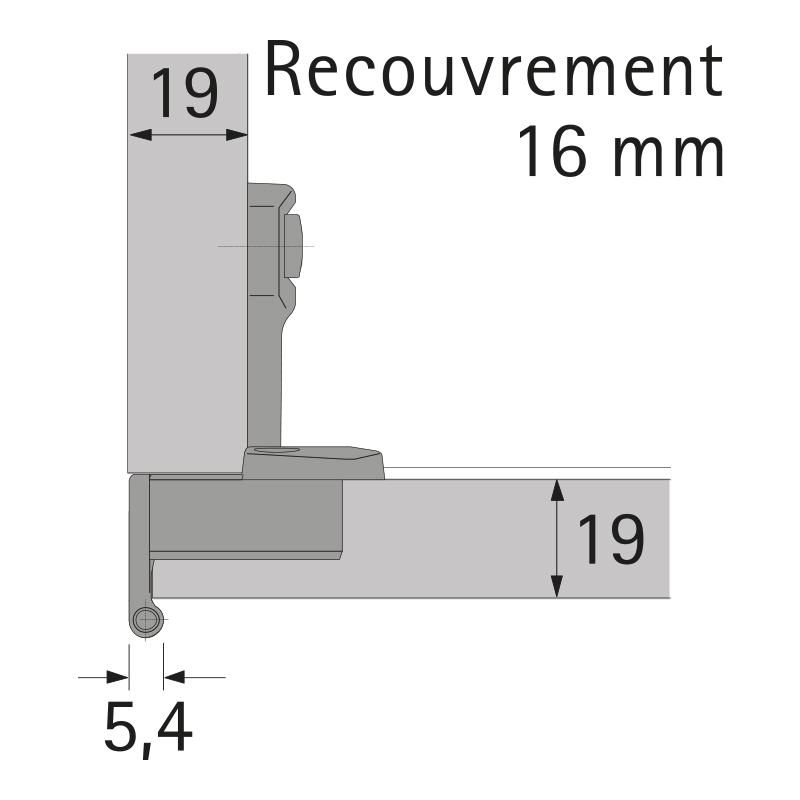 Charnière à simple pivot à clipser.Avec lacet visible.Partie latérale sur bride à crochet à expansion et vis à tête bombée prémontées.Uniquement pour panneau de 19 mm