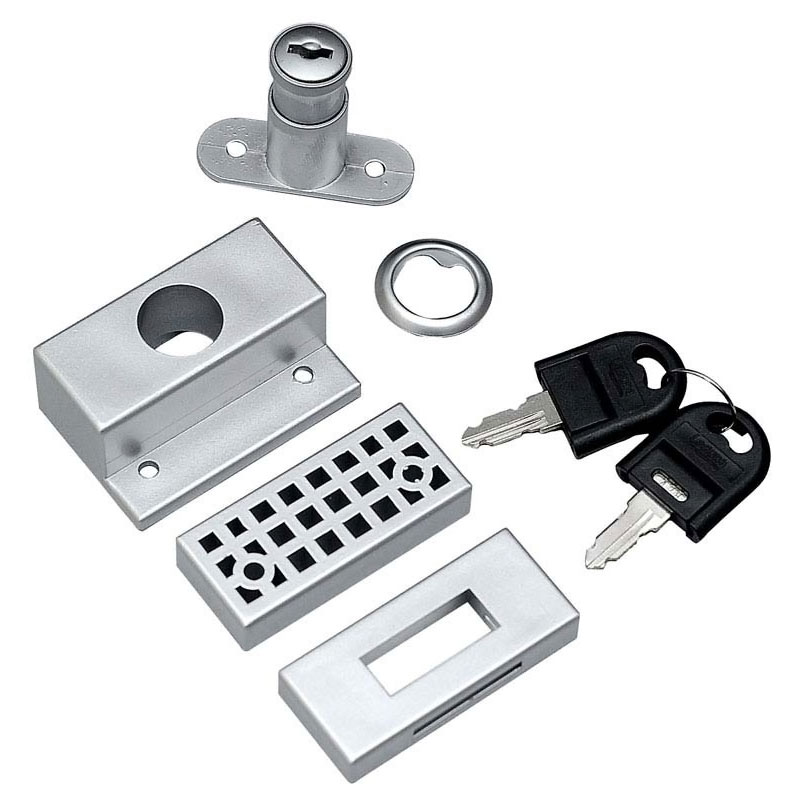 Serrure à cylindre pour porte coulissante, en zamac. Boitier en plastique décor gris/argent.Dédié à la sécurisation d'ameublements en aluminium.