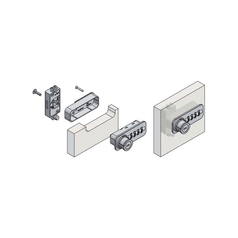 Serrure robuste à code mécanique à quatre chiffres. 10 000 combinaisons possibles.Bouton tournant à cylindre utilisable avec clé de sécurité pour déverrouillage d’urgence.Brouillage du code sélectionné à l’ouverture et à la fermeture de la serrure.Montage horizontal. Non réversible. Pour panneau bois épaisseur 18 à 21.Largeur 82,5, hauteur 33. Encastrement 79,5x 27,5. Décor noir.
