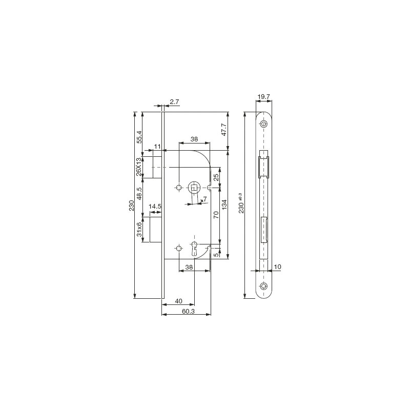 Serrure pour porte d'intérieur pleine (huisserie bois ou métal), à usage fréquent (résidentiel - tertiaire).Coffre acier plié verni.Entraxe à 70mm.Fouillot carré de 7mm.Pêne 1/2 tour réversible avec languette de glissement bombée, facilitant la fermeture.Pêne 1/2 tour et pêne dormant nickelé brillant.Têtière acier 230x20x2,5 à bouts ronds, finition vernie peinte.Garantie 10 ans. NF niveau 2.