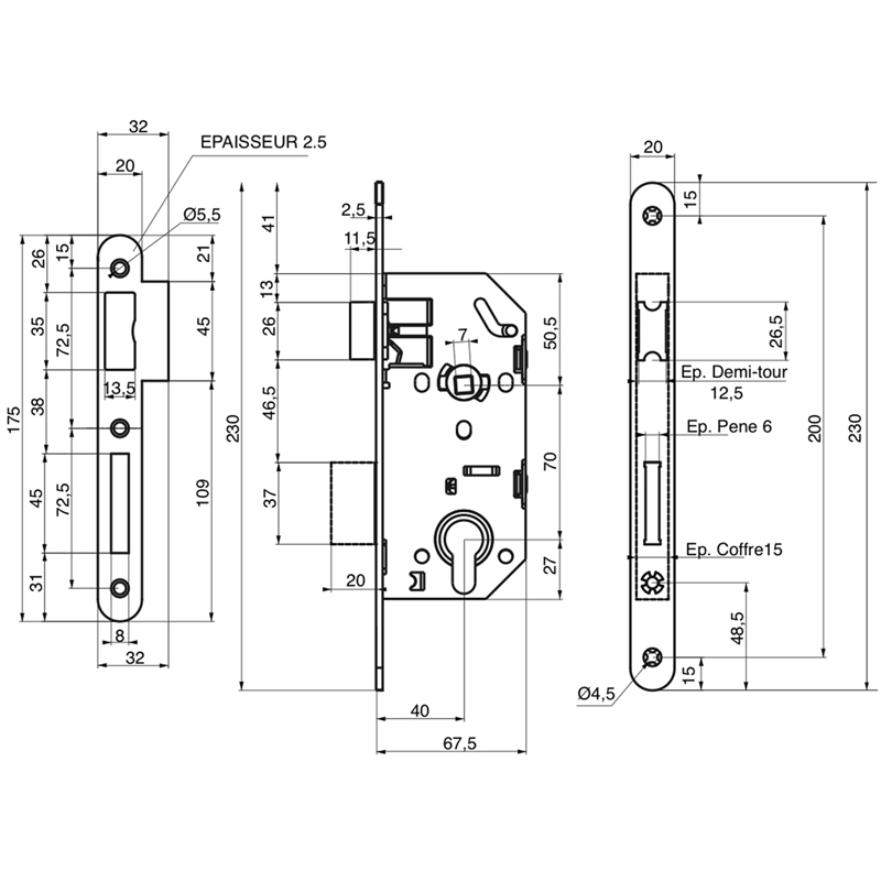 Coffre acier embouti galvanisétêtière acier bouts ronds époxy noir granitédemi-tour bi-pente alliage réversible sans démontage du coffrepêne acier galvanisémécanisme à 2 tourspour menuiserie boisdimensions têtière (L x l x é) : 230 x 20 x 2.5mmlivré sans gâche (références fabricant : 046102 ou 046100 pour bec de canne)garantie 10 ans.