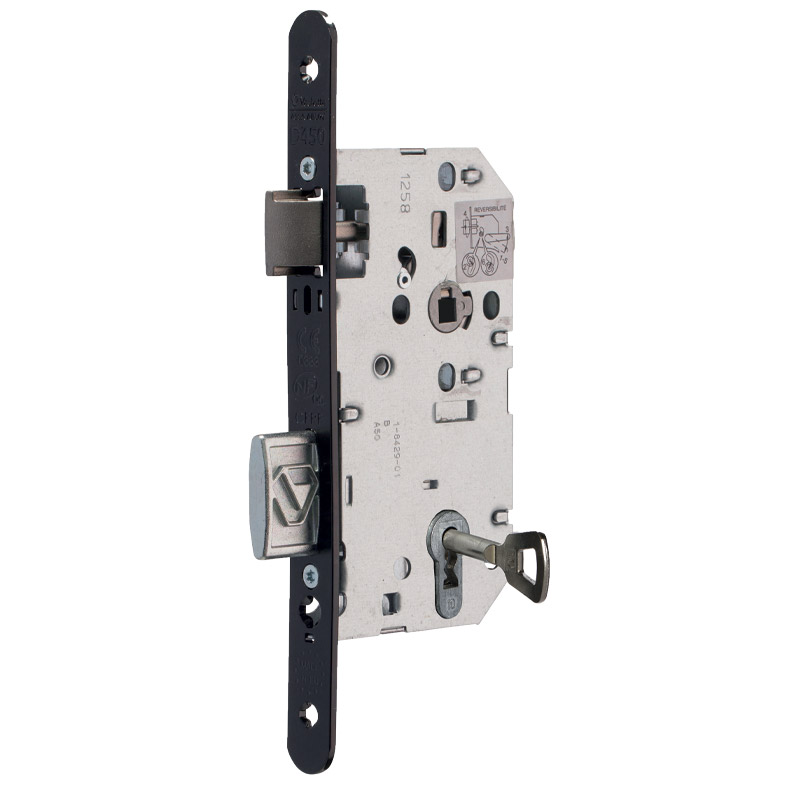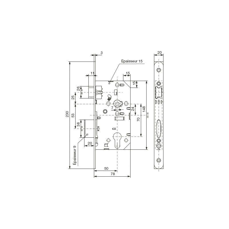 Pour porte d'intérieur ou d'extérieur à usage intensif (administrations, bureaux, écoles, hôpitaux, logements collectifs...).Coffre acier galvanisé.Têtière 230x20x3mm acier finition époxy noir, à bouts ronds. Entraxe 70mm.Fouillot carré de 7mm.Pêne demi-tour réversible (sans démontage y compris lorsque la serrure est montée dans la porte).Pêne demi-tour bombé : limite le bruit du claquement et facilite la fermeture de la porte.Pêne dormant oblong avec forme exclusive pour une meilleure résistance.Trous traversants pour vis de rosaces.Ressort de fouillot renforcé pour une excellente tenue des béquilles dans le temps.Pour cylindre profil européen (modèle clé I).