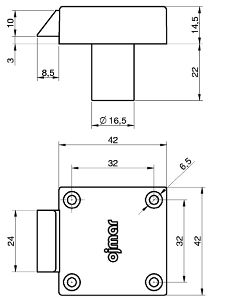 Boîtier 42x42, épaisseur 14,5. Décor nickelé. Livré sans barillet et sans rosace. Cylindre Ø16,5 Longueur 23,5