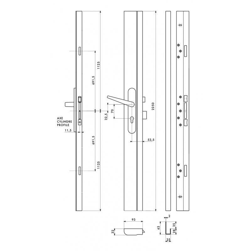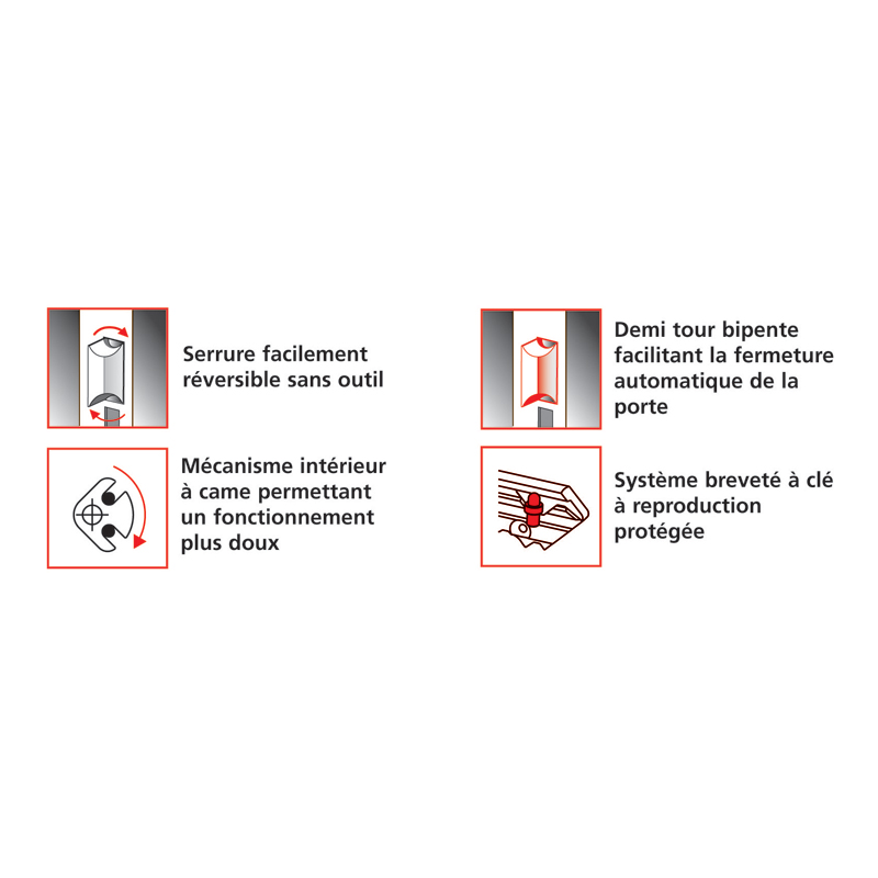 Serrure à verrouillage par 3 points latéraux de condamnation.Pour porte d'entrée d'hauteur maxi 2250mm.Boitier principal acier 15/10ème. Pour cylindre profilé européen 30 x 65mm (non fourni).Carré de 7mm.Demi-tour bipente laiton réversible sans démonatge du coffre, équerre au 1/2 tour.Pênes dormants rectangulaires 2 tours en acier zingué bichromaté.Gâche acier profilé 20/10ème.Hauteur recoupable. Garantie 5 ans.