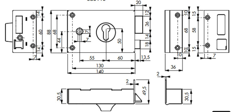 Boîtier de serrure finition époxy à fouillot, pour cylindre profilé européen (non fourni).Pour porte d'entrée.Mécanisme à 2 tours. Rappel du 1/2 tour par la clé. Carré de 7mm.Coffre 140 x 88mm et gâche en acier cambré. Pêne et demi-tour acier zingué.Garantie 5 ans.