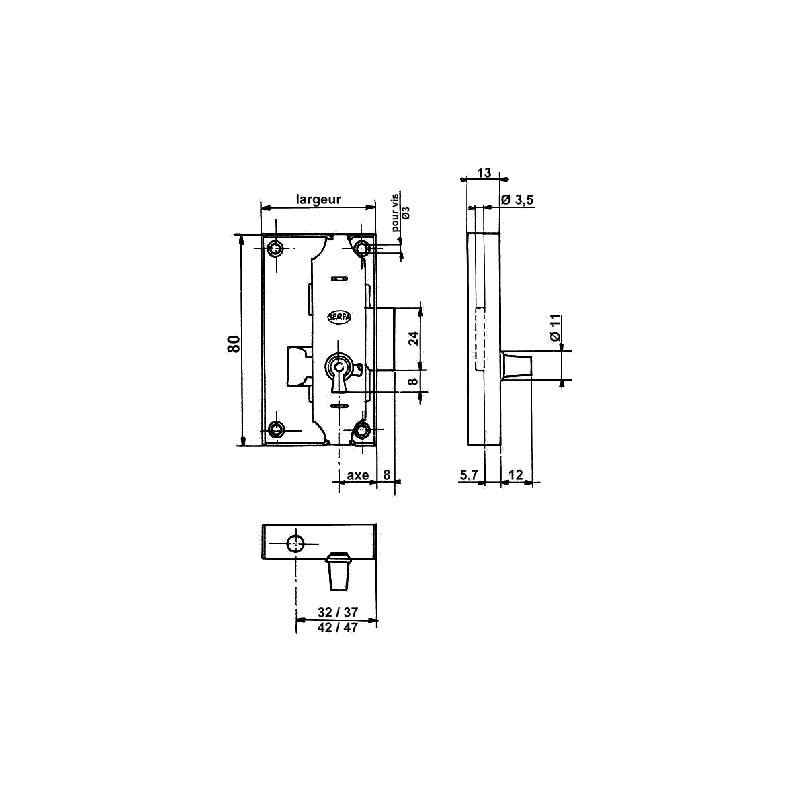 Serrure encloisonnée à espagnolette ajutage S.45, coffre acier embouti.