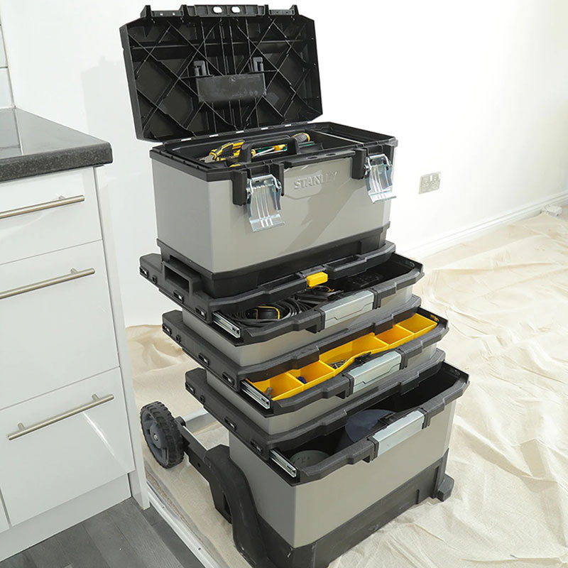 Boîte à outils amovible de 50cm avec porte outils intégré.Cadenassable.Larges attaches métalliques anti-corrosion.2 tiroirs de 10cm de profondeur monté sur glissière métal à roulement à billes.Roues de grandes diamètre (175mm) pour une manipulation aisée.Système “Cantilever” pour un accès simultané à l’intégralité des compartiments de rangement.Coffre de rangement de grande capacité idéal pour le rangement de l’électro portatif.