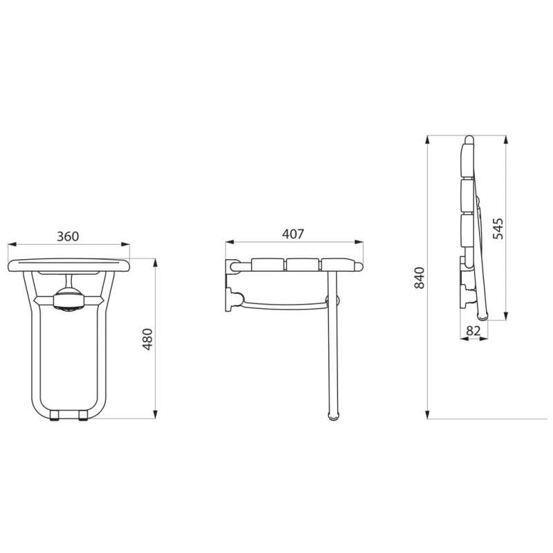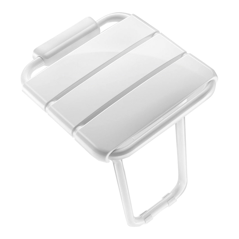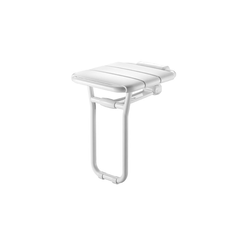 Siège de douche relevable avec pied.Fixations invisibles.Assise en larges lattes PVC.Pied rentrant guidé par un bras articulé.Structure en tube d'alu Ø25x2mm.Encombrement replié 82 x 545 mmLivré avec vis inox pour mur béton.Garantie 10 ans. Marqué CE.