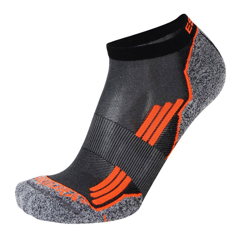 double bord côte anti-comprimant semelle respirante en fine bouclette du dessus des orteils jusqu'au tendon d'Achille renforts Cordura talon et pointe large maille variable de maintien au coup de pied triples bandes de stabilisation des appuis périmétriques couture de pointe extra fine