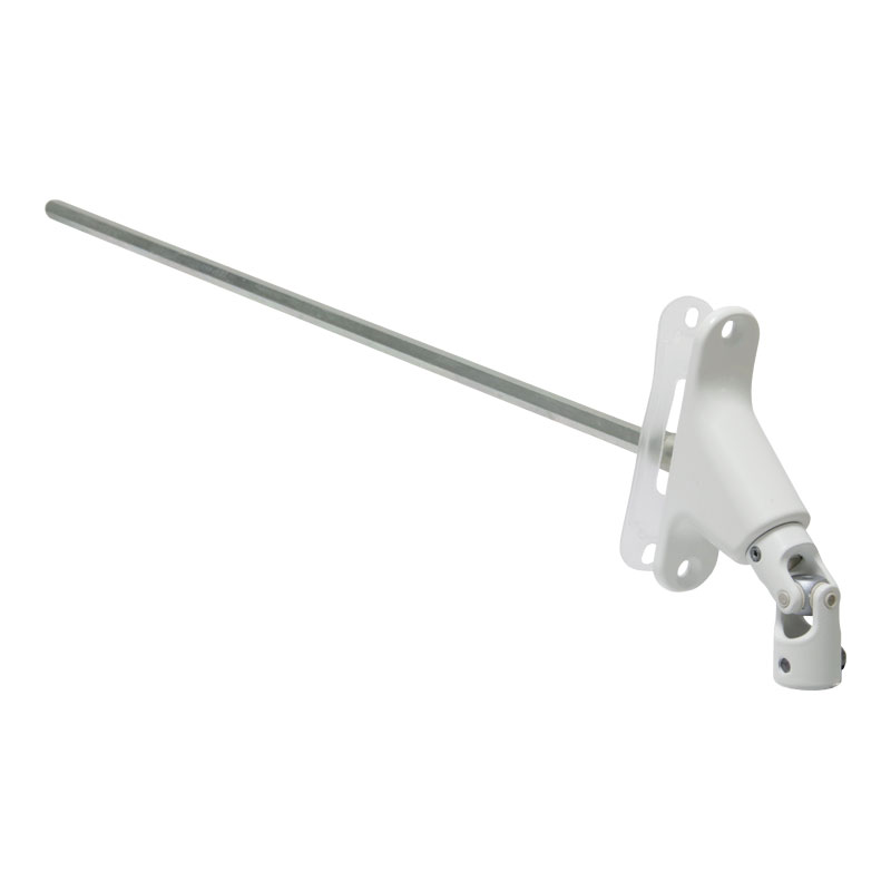 Ensemble monté sur roulement à billes acier étanche.S'utilise principalement en caisson tunnel et coffre RENO.Fixation par vis TF Ø 4.Angle de sortie de manoeuvre possible de 0° (horizontal) à 50°.Bâti : zamac.Axes et rotules genouillère : inox et alu.Tige d'attaque acier zingué passivé 6 pans de 7.Trou pour tringle Ø 12mm.