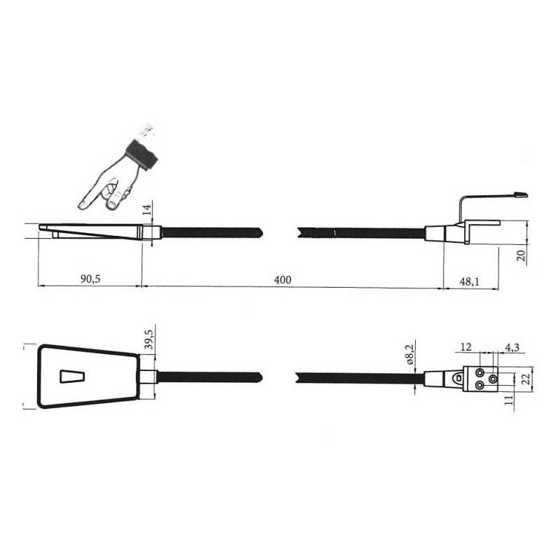 Spot équipé d'un interrupteur sensitif à 3 niveaux de luminosité sur tête de la lampe. Flexible longueur 400 mm. Fixation équerre pour pose sur chant. Livré avec alimentation séparée avec câble secteur longueur 1800 mm.