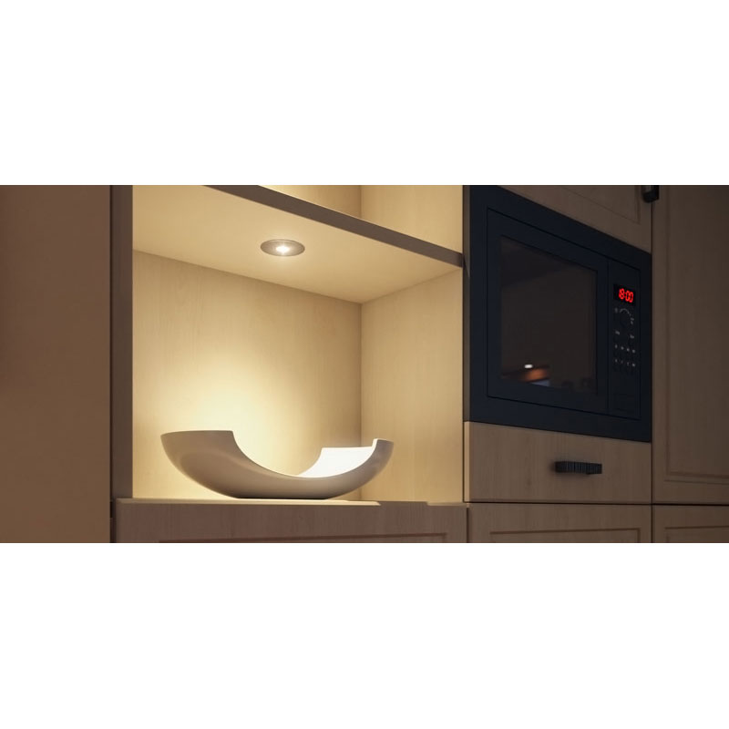 Luminaire compact, faisceau lumineux semblable à un spot halogène.Trouve parfaitement sa place sur des étagères ou niches.