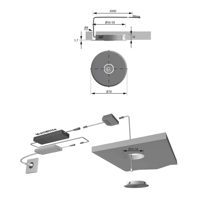 Spot à encastrer. Puissance 3,5 W. Câble de liaison longueur 3000 mm équipé d’une mini prise LED M1. Livré sans alimentation.