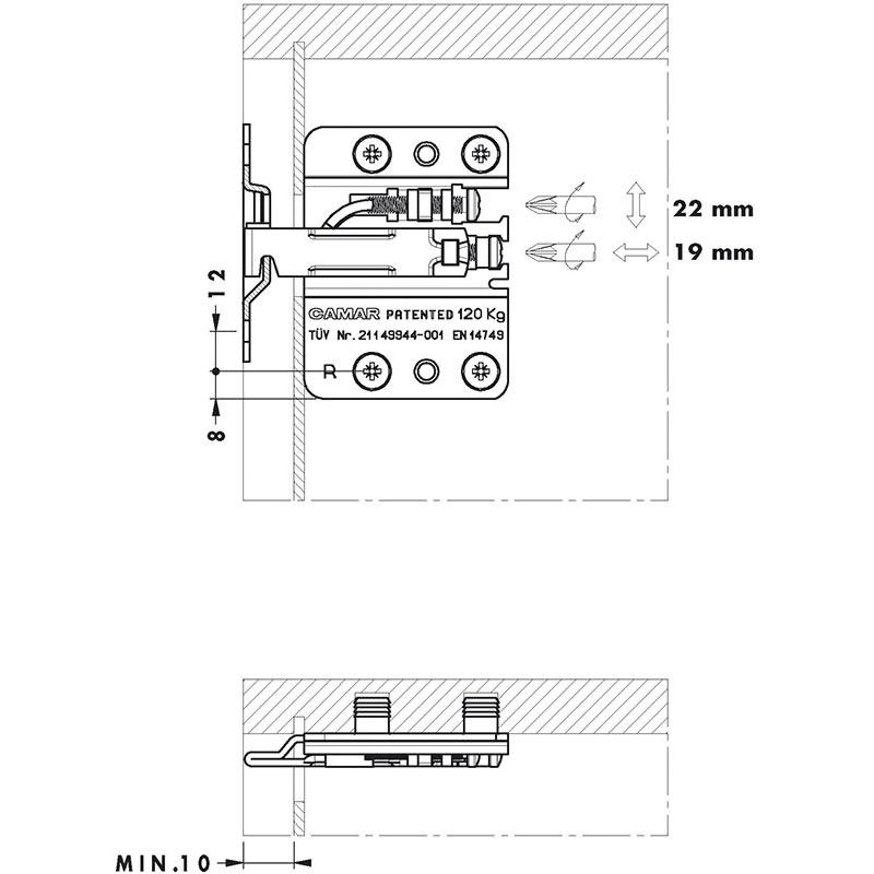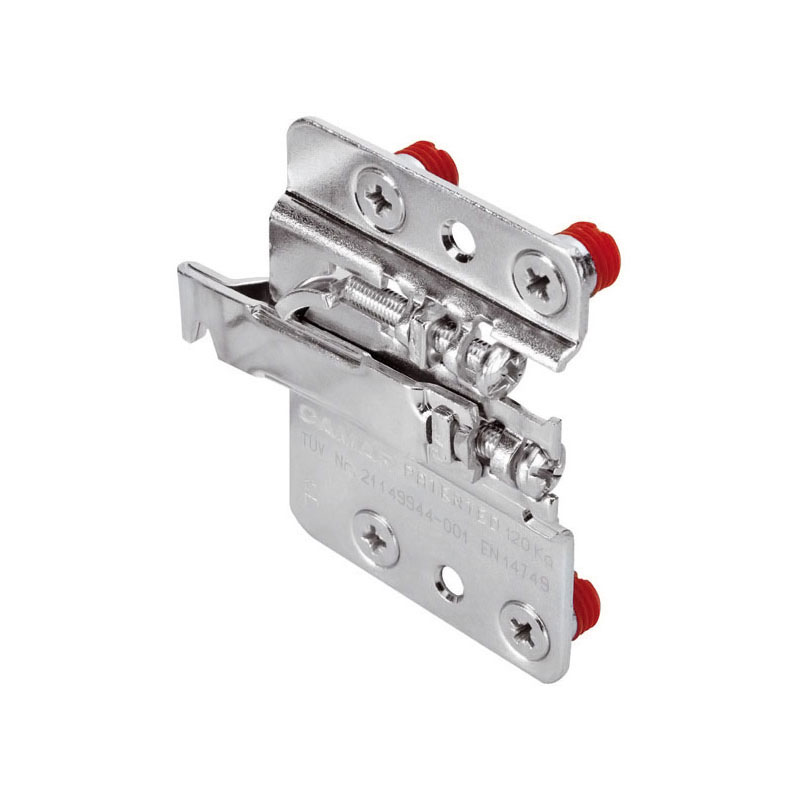 Support acier extra plat à visser pour fixation d'éléments bas.Assemblage rapide à la platine par clipsage.Réglage sécurisé par clip anti-décrochage.Fixation par tourillons Ø 10mm.Charge maximale conseillée par pièce : 120Kg