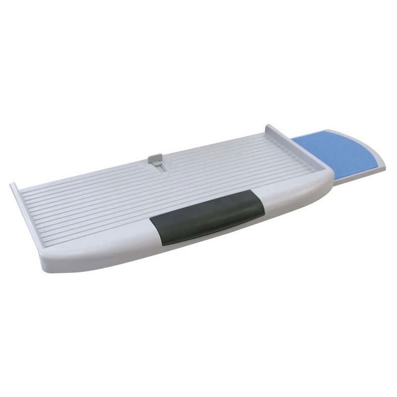 Support clavier informatique avec tablette à souris escamotable et orientable.Equipé d'un plumier.Sur coulisse à billes sortie partielle.Hauteur entre plateau et dessous de bureau réglable de 80 à 110 mm.