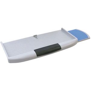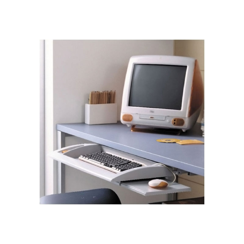 Support clavier coulissant avec plateau PVC et tablettes à souris escamotable droite ou gauche montée sur coulisses à galets en métal.