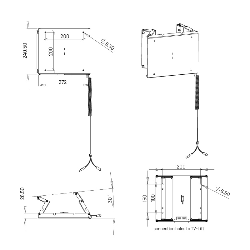 Ce support permet d'orienter manuellement l'écran plat de 30 degrés à droite et à gauche. Il se fixe sur la platine d'un lève-écran motorisé.Il est équipé d'un système de sécurité électronique qui empêche la descente du lève-écran lorsqu'il n'est pas complètement replié.Il est compatible avec les lève-écran réf. 143 70000 10002 et 143 80000 10002.
