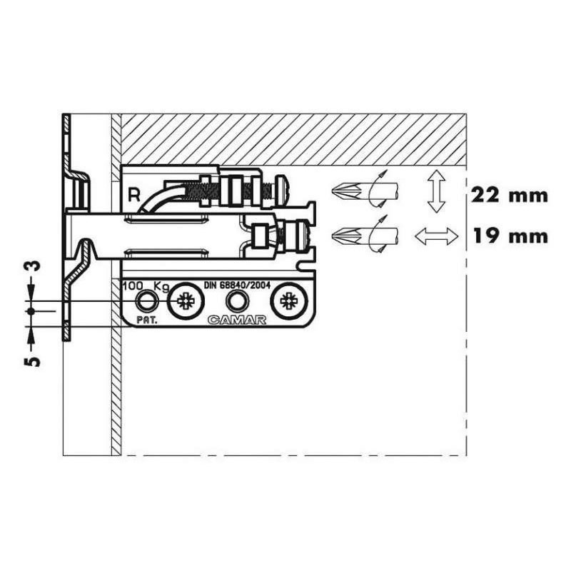 Fixation à enfoncer par tourillons Ø 10x10,5 mm.Livré sans cache.Charge maximale admissible par pièce : 850N