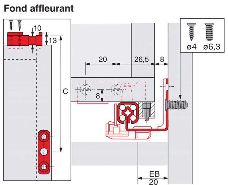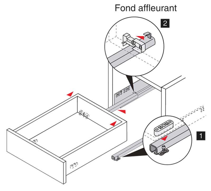Attention* :Pour la découpe de la tablette ou du tiroirTenir compte de l’épaisseur de la fixation arrière épaisseur 10 mm.Dimensions d’utilisation :Tiroir/tablette Longueur : Longueur coulisse -10 mm.Tiroir/tablette Largeur : Largeur intérieure du caisson -16 mm.