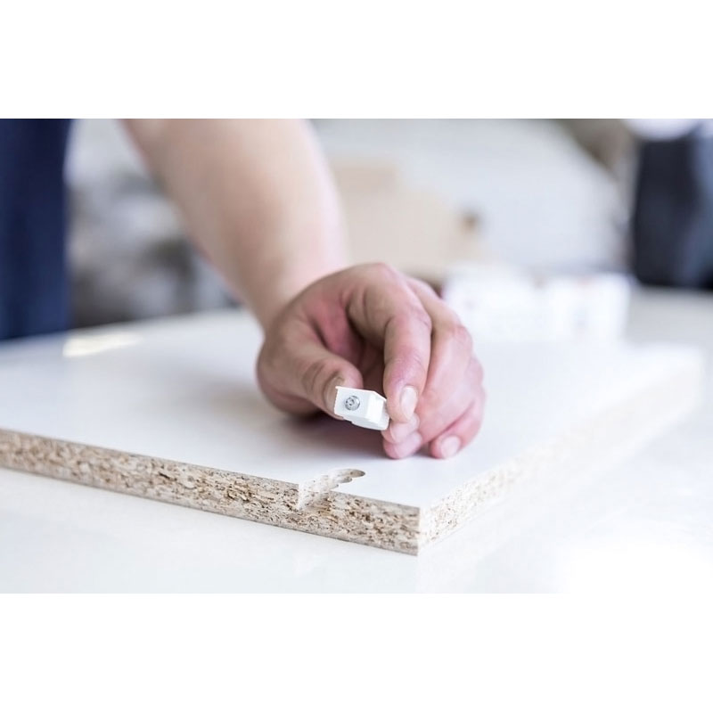 Remplace avantageusement les assemblages par excentrique.Gain de temps à la production et à la pose. Mise en œuvre plus rapide et plus simple.Pas de perçage sur chant. Plus besoin de tourillons.Transport à plat des panneaux avec Cabineo posé.Grande force de serrage. Usinage rapide par CNC. Boitier plastique, pose à entailler. Mécanisme métal.3 perçages Ø15 mm, profondeur 11 mm, longueur entaille 33,5 mm. Vis de serrage filetage euro intégré. Longueur de la vis : 12 mm.Perçage Ø5 mm sur panneau opposé.Utilisé sur panneau épaisseur mini 16 mm ou pour assemblage à 90°.