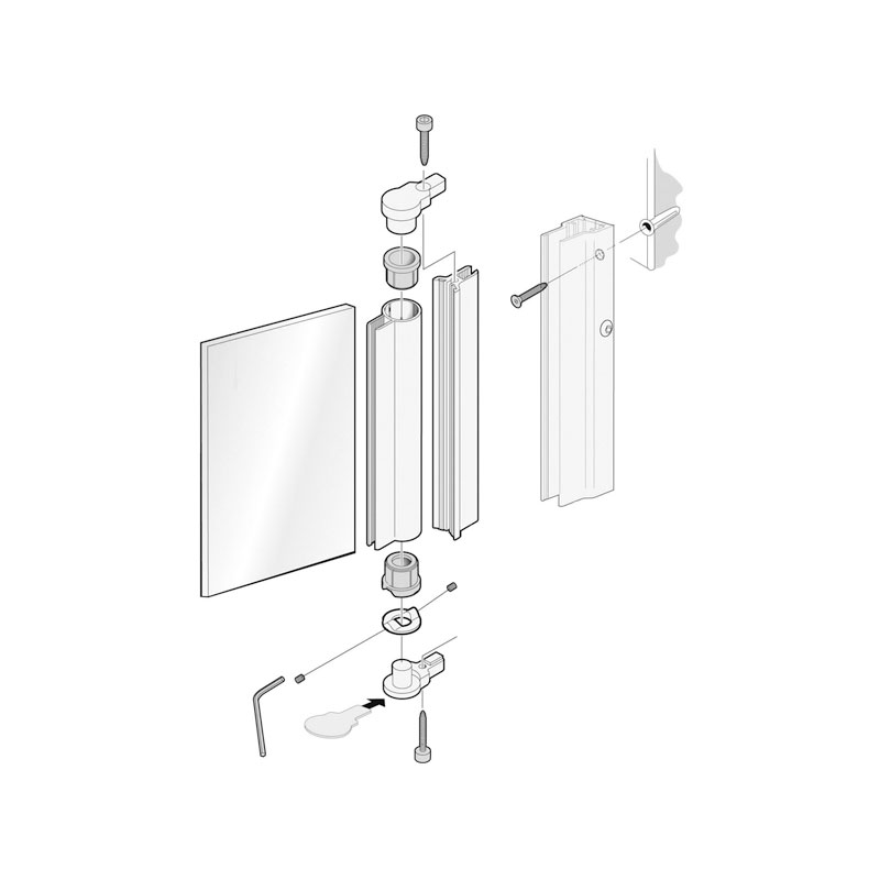 Ensemble de 2 profils :- 1 profil mural fixation invisible à visser- 1 profil charnière (= 1 profilé intermédiaire avec brosses + 1 profilé pour le verre)- 1 set d'accessoires avec emboutsProfils recoupables.Avec mécanisme de came levante.Réglage continu du point zéro.Pas d'encoche dans le verre, collage avec colle aquarium uniquement.Pour les constructions à deux vantaux, veuillez commander 2 sets.